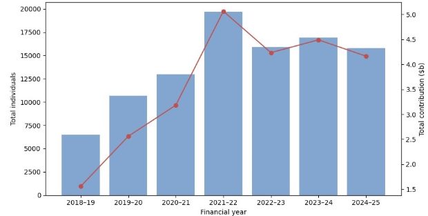 Total individuals and downsizers contributions by financial year