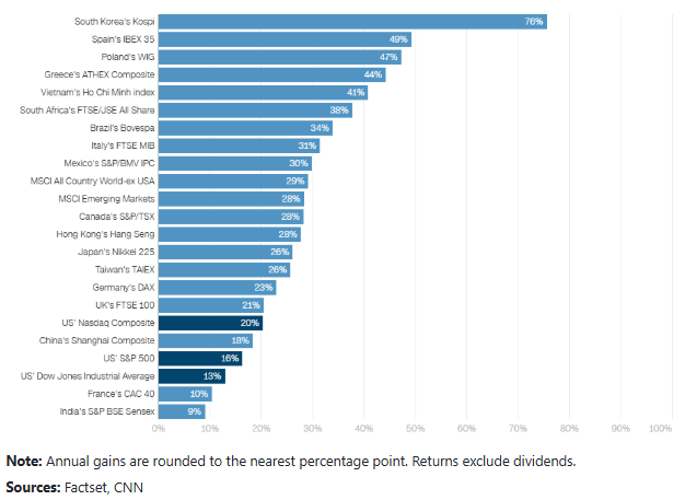 Annual percentage gain for benchmark stock indices around the globe, in 2025