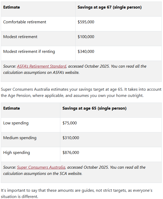 Both ASFA and Super Consumers Australia also estimate the amount you should be aiming to have in your super account (or saved somewhere else) when you retire, to support your retirement spending.