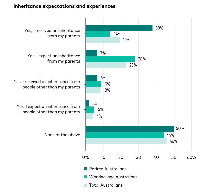 Around one in two Australians have received or expect to inherit money or property, either from their parents or others.