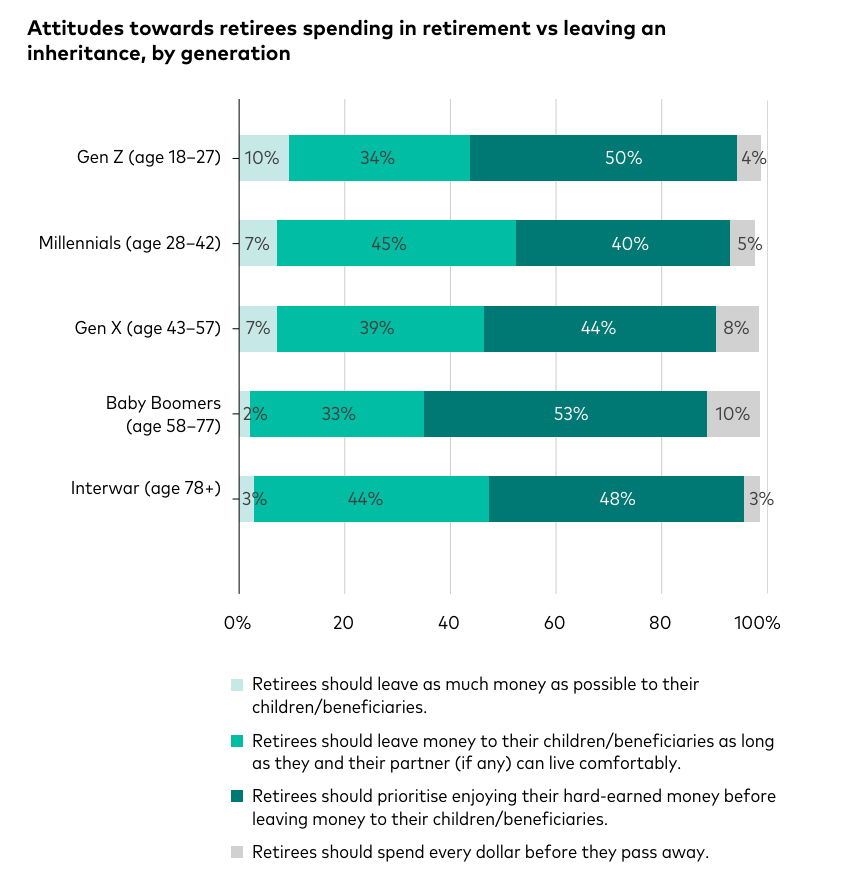 10% of Baby Boomers (aged 58 to 77) in Australia believe retirees should spend all of their money in retirement, while 10% of Gen Z (aged 18 to 27) believe retirees should leave as much money as possible to their children/beneficiaries.